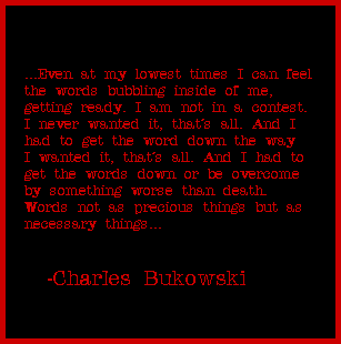 I'm in the bubbling up stage, not ready to write yet, at least not to put anything much online. My Imaginary Friend puts up with my daily mental chatter and my analysis of my dreams. Yes, we are on speaking terms again. The next part of that Charles Bukowski quote goes: Yet when I begin to doubt my ability to work the word I simply read another writer and then I know that I have nothing to worry about. My contest is only with myself: to do it right, with power and force and delight and gamble... I relate to the need to get the words down (and in my case create images), and I have a need to do it my own way. I didn't know I had a Windows Live Space. I had been using an old Hotmail sign in page and didn't know things had changed. When I found out, I was looking around and then just wanted to test some things out to see how it worked there. I already have a blog that I haven't been using. I have mostly just observed the Spaces community. I would like to thank those who have allowed me a glimpse into their thoughts, feelings and lives. "Not knowing when the dawn will come I open every door." -Emily Dickinson ![]()